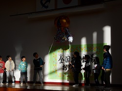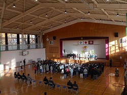 体育館のステージに貼り出された「祝 全国大会出場 おめでとう」の大きな文字の周りには全校児童のお祝いメッセージが添えられています。学校全体がお祝いムードに包まれ、寒い朝でしたが、最高に気持ちがよく、嬉しい金曜日のスタートになりました。
