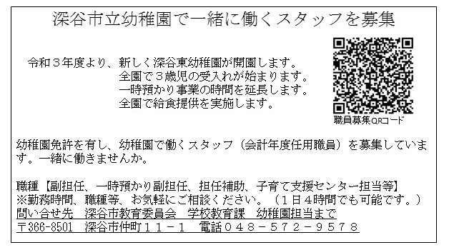 ・深谷市立幼稚園の副担任、一時預かり副担任、担任補助 など