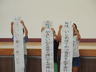 図書委員の発表の後、児童会がいじめ撲滅宣言をしました。
