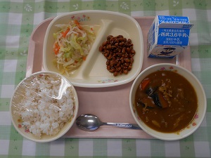 本日の給食は、夏野菜のカレーライスと大豆のシャリシャリ揚げです。カレーには、夏野菜のかぼちゃとナス、ピーマン、トマトが入っています。夏野菜は色鮮やかな見た目で、彩りも良くなりますね。また、夏野菜に含まれているビタミンは、油に溶けやすい性質があるため、油を使った料理で体への吸収率が良くなります。オリーブオイルや魚の油と一緒に食べると健康にいいとされています。