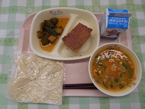 本日の給食は、キムチ入りごま味噌ラーメンと深谷レンガパンケーキです。