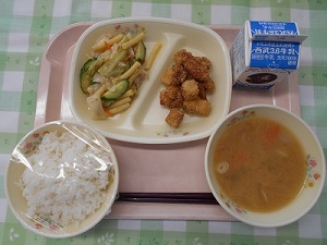 本日の給食は、鶏肉と高野豆腐のゴマダレとマカロニサラダです。