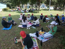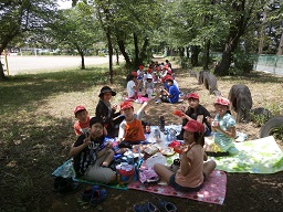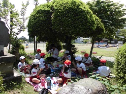 5月19日(木)に校舎から出て、校地内の緑の中で、お弁当を食べました。さわやかな5月晴れ。グループで楽しくおしゃべりをしながらいただきました。