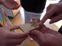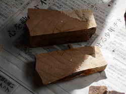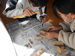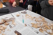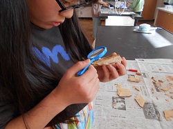 1人5つずつの地層の塊を注意深く掘り進めていきます。地層の境目にマイナスドライバーを当ててハンマーで叩き、そこから大昔に堆積した葉や虫の化石が出てくることがあります。