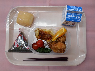 自分で持ってきた、空のお弁当箱に給食を詰めました。