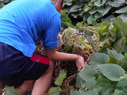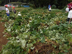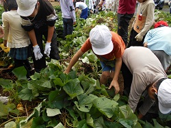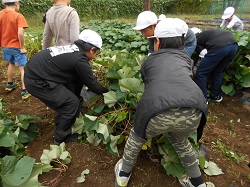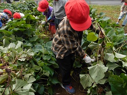 さつまいもが立派に育っています。いもが大きく、美味しくなることを願い、たくさんの葉が繁った弦を力いっぱい持ち上げていました。