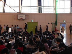 本日、全国小・中学校リズムダンスコンクールに出場するたんぽぽ・すみれ学級のお友達に向けて、児童会が中心になり壮行会が行われました。