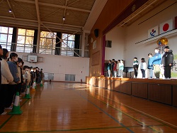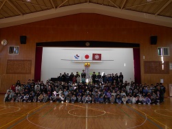 体育館のステージに貼り出された「祝 全国大会出場 おめでとう」の大きな文字の周りには全校児童のお祝いメッセージが添えられています。学校全体がお祝いムードに包まれ、寒い朝でしたが、最高に気持ちがよく、嬉しい金曜日のスタートになりました。