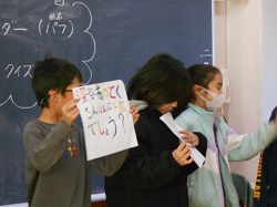 3年生は、グループに分かれて、保護者の方にもご参加いただき3年生で学習した内容をクイズ形式で答えを競い合いました。グループごとに相談して答えを出します。終始楽しく笑いもあり、和やかな雰囲気でた。