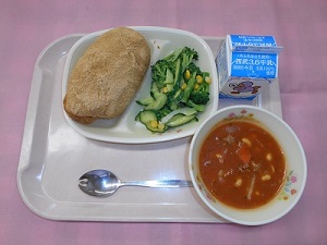 給食には、成長期に必要なたんぱく質がたくさん取れるように、様々な工夫がされています。きなこ揚げパンのきなこやポークビーンズに入っている大豆などの植物性たんぱく質をはじめ、豚肉やベーコンなどの動物性たんぱく質も、本日のメニューでは摂ることが出来ます。たんぱく質をしっかりと摂取して、風邪やウイルスに負けない強い体を作りましょう。