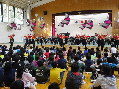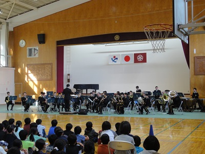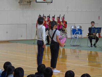 音楽隊の演奏に合わせ、校歌をいっしょに歌いました。