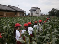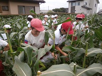 全校児童が3本ずつとうもろこしを収穫をさせていただきました。