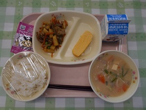 本日の給食は、じゃがいものきんぴら煮とスタミナスープです。