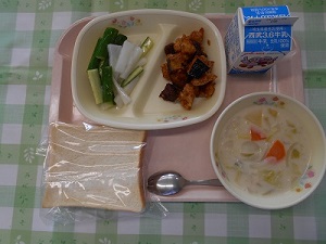 本日の給食は、鶏肉とかぼちゃのオレンジソースとクラムチャウダーです。