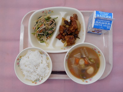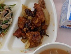 今日の給食は、ふっかちゃんの絆やきとりでした。