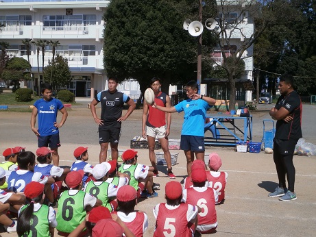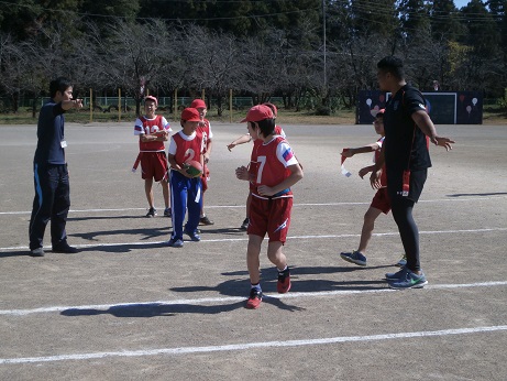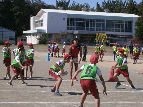 10月13日(火)に6年生が、正智深谷高等学校の高校生と埼玉工業大学の大学生ににタグラグビーを指導していただきました。パスの出し方、キャッチの仕方、ルールやマナーなど集団ゲームでの楽しみ方を教わりました。子どもたちは、体格の良い高校生ラガーマンに圧倒されながらも、楽しんでゲームを行うことができました。よい経験となりました。
