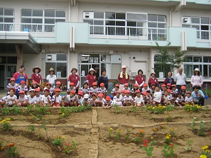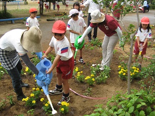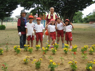 6月9日(木)に3年生の児童が、ガーデニングに挑戦しました。グループ毎にデザインを考え、学校応援団の皆様にご指導いただきながら、一緒に花植を行いました。マリーゴールドや百日草などきれいな花が咲いています。楽しいデザインがありますので、是非ご覧ください。