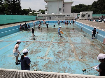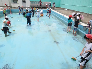 それぞれの割当時間に担当場所のプール清掃を行いました。