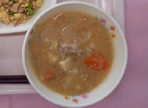 豚肉や根菜類、豆腐、ねぎなどが入り、豚汁のような感じです。