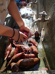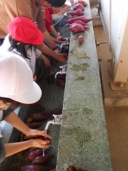 準備として支援籍のお友達がさつまいもを洗ってくれました。手際よく、みんなで力を合わせて洗いました。お水が冷たかったけど頑張りました。