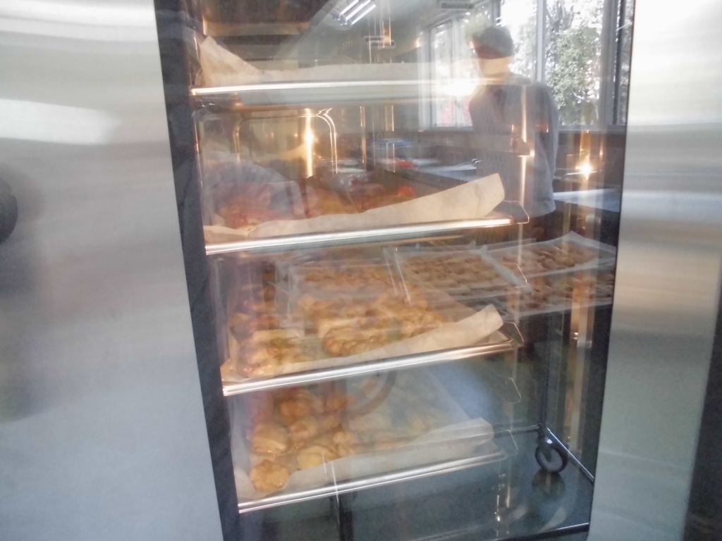 スチームコンべクションでとり肉を焼いて、クラスごとに分けます。