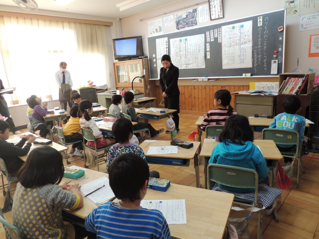 「じゅんじょよくかく~のりもののことをしらせよう~」の学習で、働く自動車について調べたことをメモし、そのメモをもとに説明する文章を書きました。段落もつけて、「ですから」や「また」といった言葉も使いながら、文章を全員が書くことができました。
