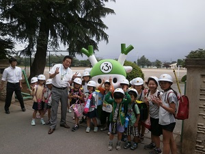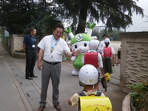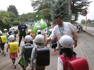本郷小学校に来て、校門のところで子供達を出迎えてくれました。
