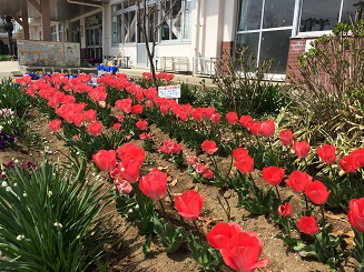 そんな本郷小では、今たくさんの草花の見頃を迎えています。林間コースの桜並木のさくらは、現在五分咲きほどです。また、学級園のチューリップが咲きそろい、雑草の緑の間には、黄色のたんぽぽも目立っています。4月に、元気に登校してくる子ども達を待っています。