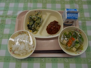 本日の給食は、ハンバーグとキャベツのペペロンチーノ風です。