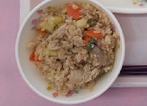 混ぜご飯の具を給食室で作り、届いた茶飯に混ぜ込み作りました。