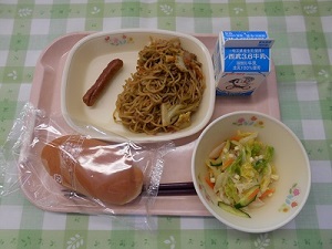 本日の給食は、焼きそばとウインナーです。