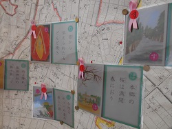 階段の踊り場に掲示してある岡部郷土かるた。本郷地区内の地図に、本郷に関する札にピンクのリボンをつけて、旧岡部町を詠んでる札を新たに掲示しました。