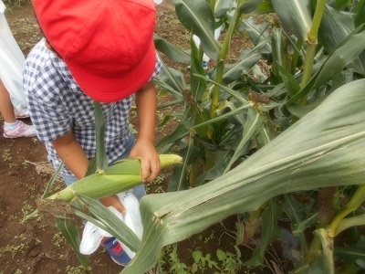 吉川様の畑のとうもろこしを2,3本ずつ獲らせていただきました。