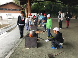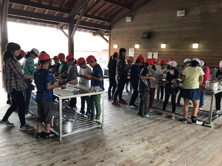 班ごとに分かれ、協力してカレーを作っています。