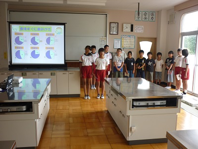 保健委員の児童が、「おやつに関するアンケート結果」を報告した後、