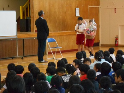 代表児童がお礼の言葉と花束を渡しました。