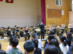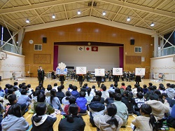 軽快なメロディーの「観光列車」から始まり、楽器紹介をしながらの曲はオズの魔法使い「虹のかなたに」で、木管楽器と金管楽器の音の違いを感じながら、全部の楽器の音が重なった時、迫力あるサウンドになりました。ディズニークラッシックレビュー、ミセスグリーンアップルメドレーと続き、本郷小学校の皆さんの顔がほころび、自然にリズムをとったり、口ずさんでいる姿がありました。
