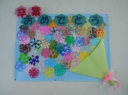 職員室前の廊下の壁面に、卒業生への切り絵のメッセージを掲示しました。