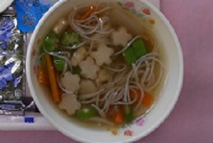 七夕スープには、天の川をイメージしたそうめん、星をあらわすオクラと星麩、